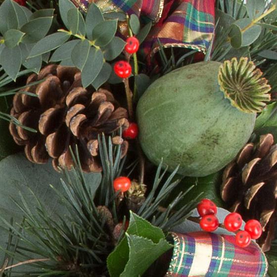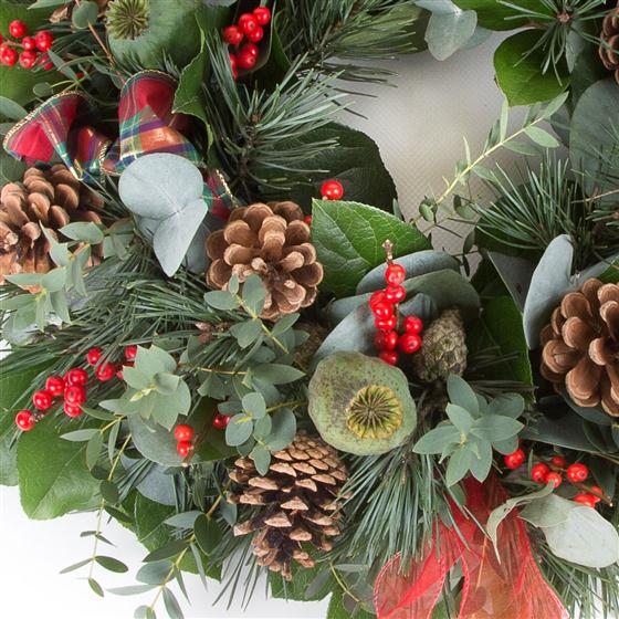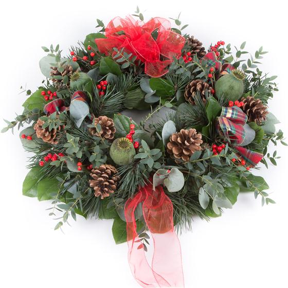 A fresh spruce door wreath including ribbon and cones. A perfect, long lasting gift.